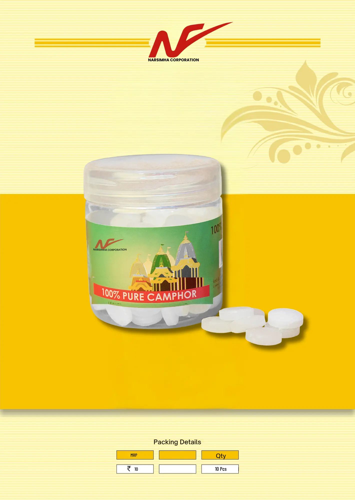 Experience the purity and power of Narshima Corporation Camphor, crafted to deliver superior fragrance, long-lasting burn quality, and unmatched purity. Made from 100% natural ingredients, our camphor undergoes a double-purification process to ensure a clean, smokeless burn—ideal for daily puja, aromatherapy, meditation, and air purification.