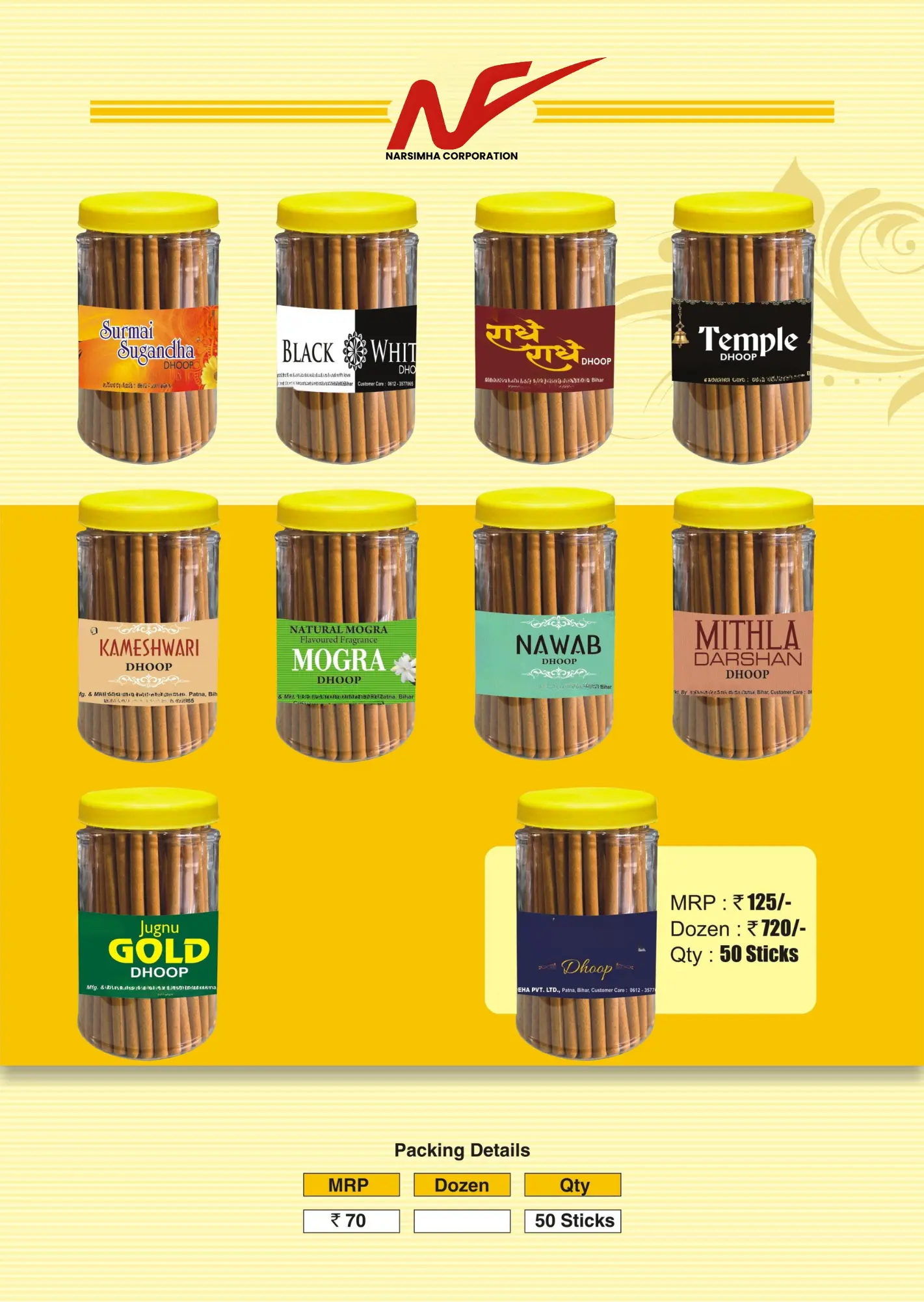 Available in a wide range of premium fragrances—Surmai Sugandha, Black White, Radhe Radhe, Temple, Kameshwari, Mogra, Nawab, Mithila Darshan, Gold, and Premium—each variant offers a distinct aromatic experience suited for different moods, rituals, and preferences.